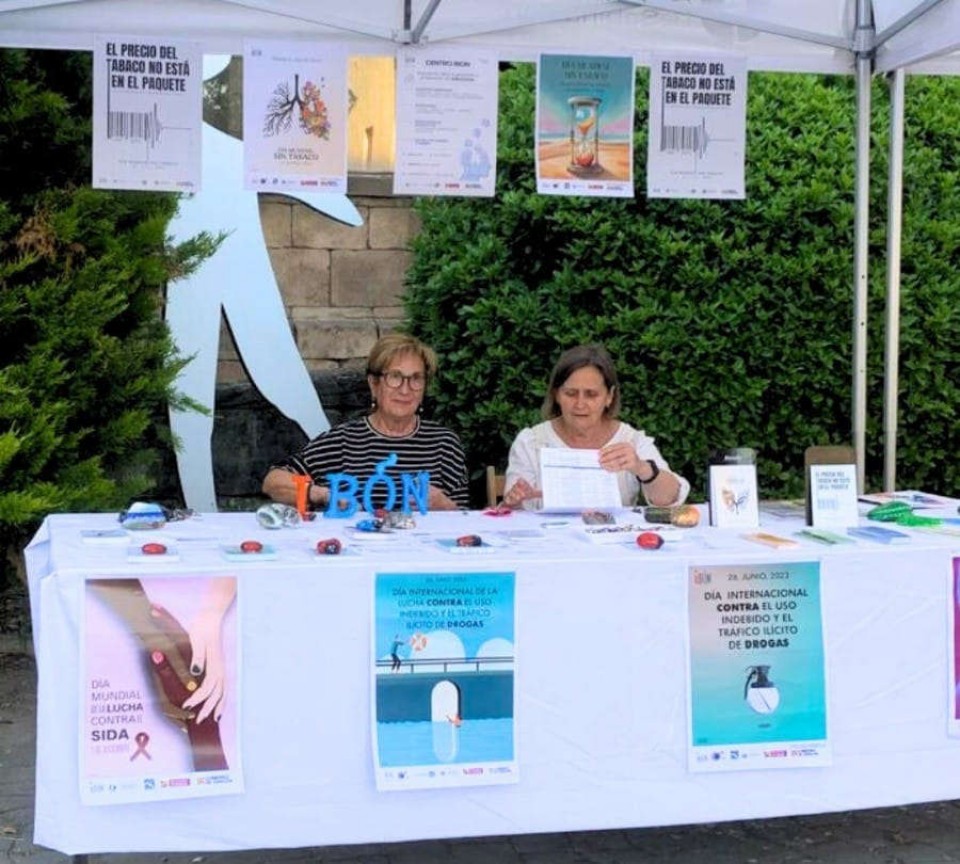 María Charte, Directora General de Inclusión y Voluntariado del Gobierno de Aragón, y Susana Oliván visitando el stand de IBÓN en la Feria del Voluntariado en Huesca.
